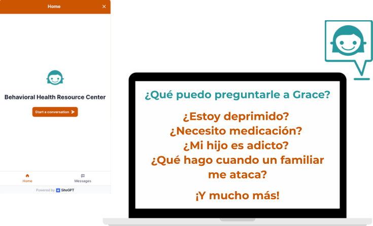 Estamos aquí para proporcionar a las personas, las comunidades, las organizaciones y las familias las herramientas y los recursos necesarios para superar los problemas de salud conductual y las adicciones. Hable con Grace, nuestra amable asistente de AI, para saber más sobre cómo ayudarse a sí mismo o a un ser querido. Ella puede proporcionarle información y recursos para sus preguntas sobre salud conductual y adicción.